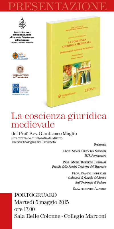 Martedì 5 maggio 2015, alle ore 17:00, presso la Sala delle Colonne del Collegio Marconi (in Portogruaro, Via del Seminario n. 34) si terrà la presentazione del nuovo libro dell’Avv. Gianfranco Maglio (già Presidente della Camera degli Avvocati di Portogruaro), “La coscienza giuridica medievale”.Considerato l’interesse culturale del tema trattato e il livello dei relatori che interverranno, auspichiamo una viva e ampia partecipazione.