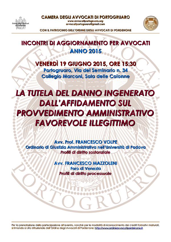 Carissimi Colleghi,come probabilmente già avrete avuto modo di leggere nella relativa sezione del sito del Consiglio dell’Ordine degli Avvocati di Pordenone, la Camera degli Avvocati di Portogruaro, in collaborazione con il Lions Club di Portogruaro e con il patrocinio del Comune di Portogruaro, oltre che del Consiglio dell’Ordine, come di consueto, ha organizzato per la data del 13 novembre 2015, dalle ore 16:00 alle ore 18:30, un interessante incontro di aggiornamento sul più che attuale tema della negoziazione assistita da avvocati (art. 6, D.L. 132/2014; si veda la locandina pubblicata sul sito).