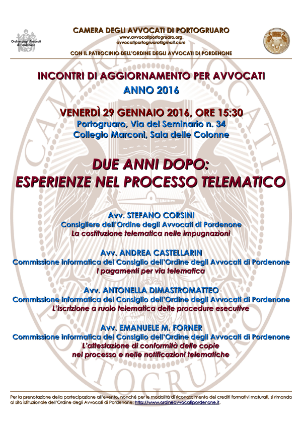 Con gennaio prende il via il ciclo 2016 degli ormai tradizionali incontri di aggiornamento organizzati dalla Camera degli Avvocati di Portogruaro.