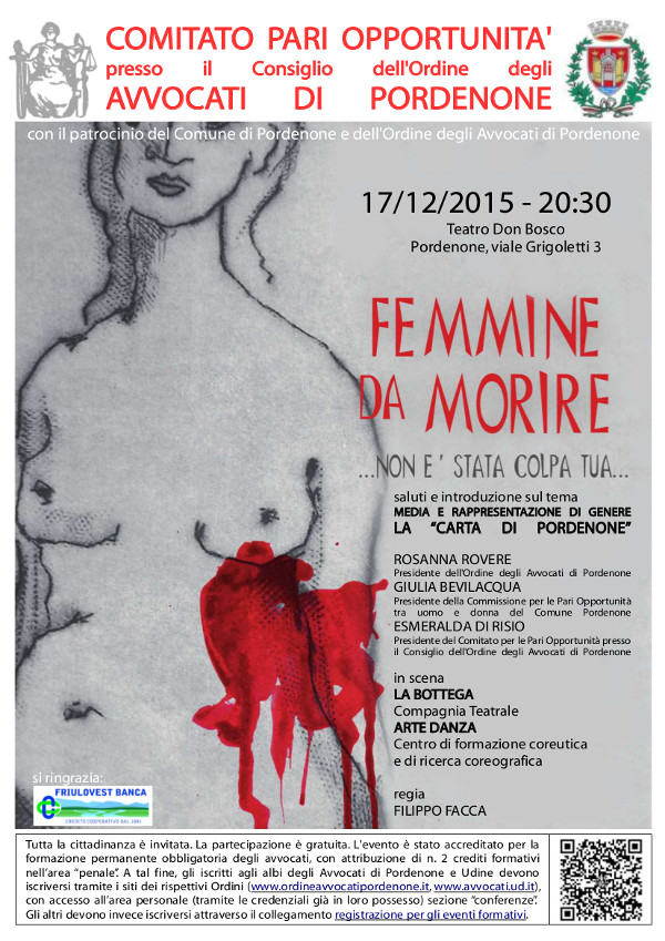 Cari Colleghi,come avrete appreso dalla Newsletter dello scorso venerdì, il Comitato Pari Opportunità presso il Consiglio dell’Ordine degli Avvocati di Pordenone ha organizzato, per il 17 dicembre 2015, un evento — formativo e culturale al contempo — estremamente interessante: verrà, infatti, rappresentato a Pordenone, presso il Teatro Don Bosco, alle ore 20.30, uno spettacolo teatrale dal titolo “Femmine da morire – non è stata colpa tua”.