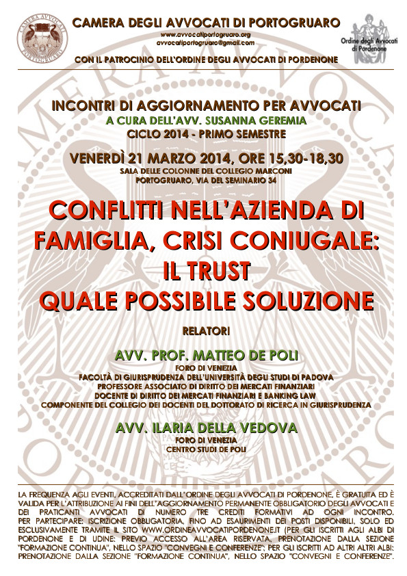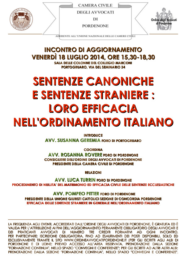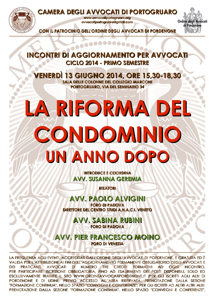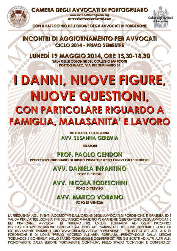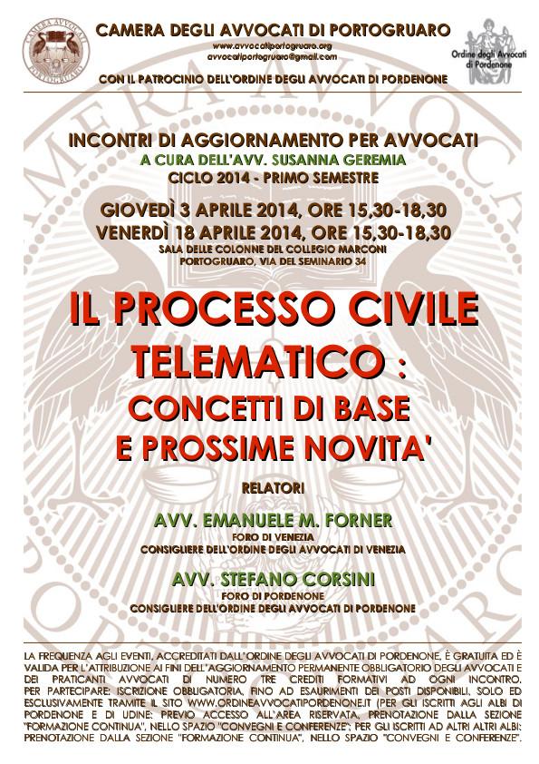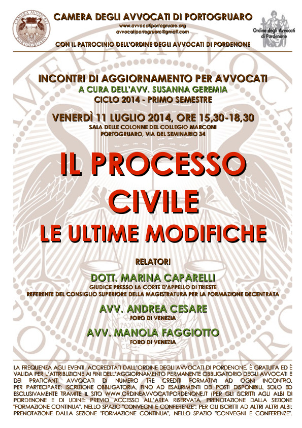 Anche per l’anno 2014 la Camera degli Avvocati di Portogruaro organizza, a cura dell’Avv. Susanna Geremia, l’ormai tradizionale ciclo di incontri di aggiornamento per gli Avvocati (accreditati dal Consiglio dell’Ordine degli Avvocati di Pordenone ai fini della formazione continua obbligatoria).