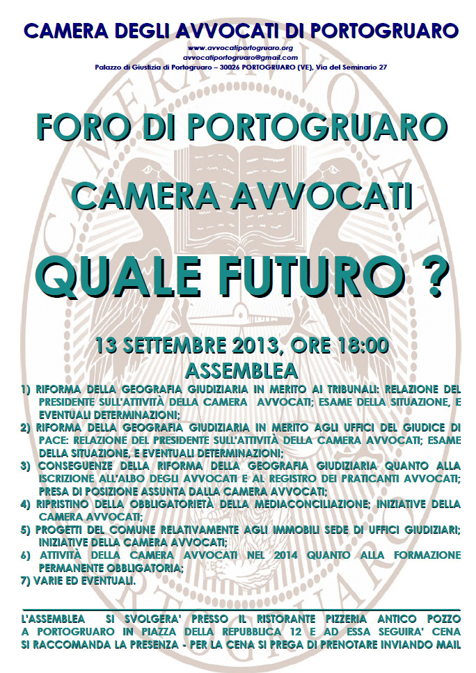 Come preannunciato, essendo necessaria una Assemblea, per rivedere il programma delle attività, anche in dipendenza degli sviluppi che, in un senso o nell'altro, vi saranno, sono a convocare l'Assemblea della Camera degli Avvocati di Portogruaro per venerdì 13 settembre 2013, alle ore 18:00, presso il ristorante pizzeria "Antico Pozzo" a Portogruaro in piazza della Repubblica 12, con il seguente o.d.g.: