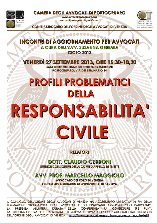 Per gli ultimi due incontri di aggiornamento di quest'anno verrà fatta richiesta di accreditamento al Consiglio dell'Ordine degli Avvocati di Pordenone (divenuto nelle more unico competente ratione loci, per la sede dell'evento), a valere, giusta regolamento dell'Unione Triveneta dei Consigli degli Ordini degli Avvocati, anche per gli iscritti all'Ordine degli Avvocati di Venezia.