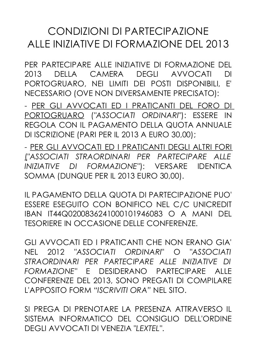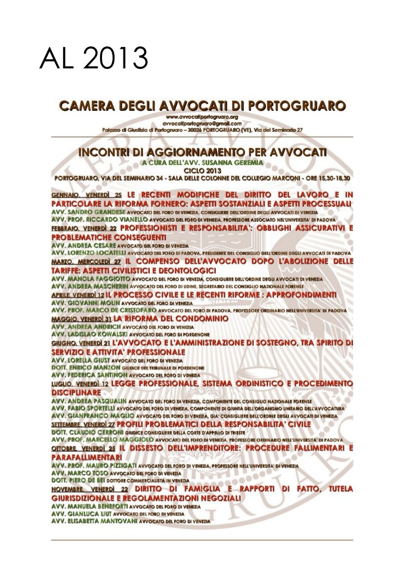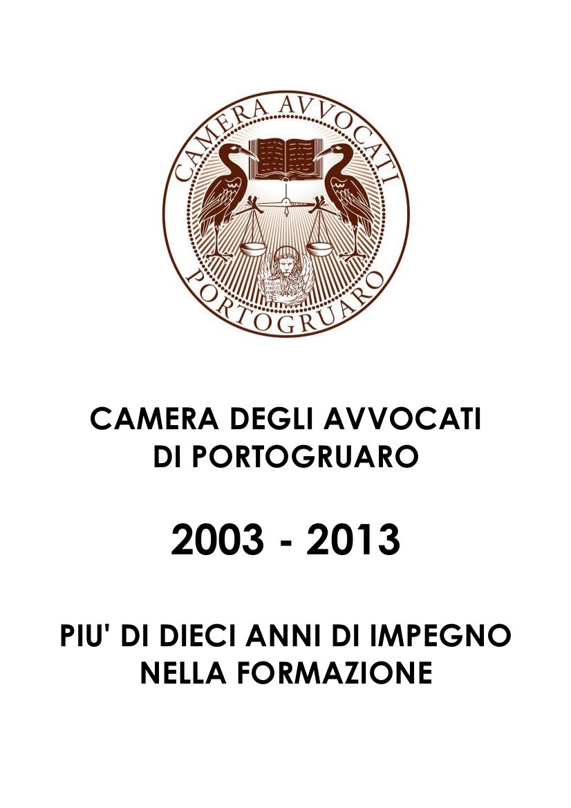 relativamente alla Formazione 2013 negli ultimi mesi è intercorsa un po' di dialettica tra la Camera degli Avvocati di Portogruaro e il Consiglio dell'Ordine degli Avvocati di Venezia, complici le importanti riforme in corso della Geografia Giudiziaria e dell'Ordinamento Forense; mi riporto, al riguardo, all'Assemblea del 14.12.12, e alle successive comunicazioni, senza però tornare sull'argomento, essendo questione ora superata.