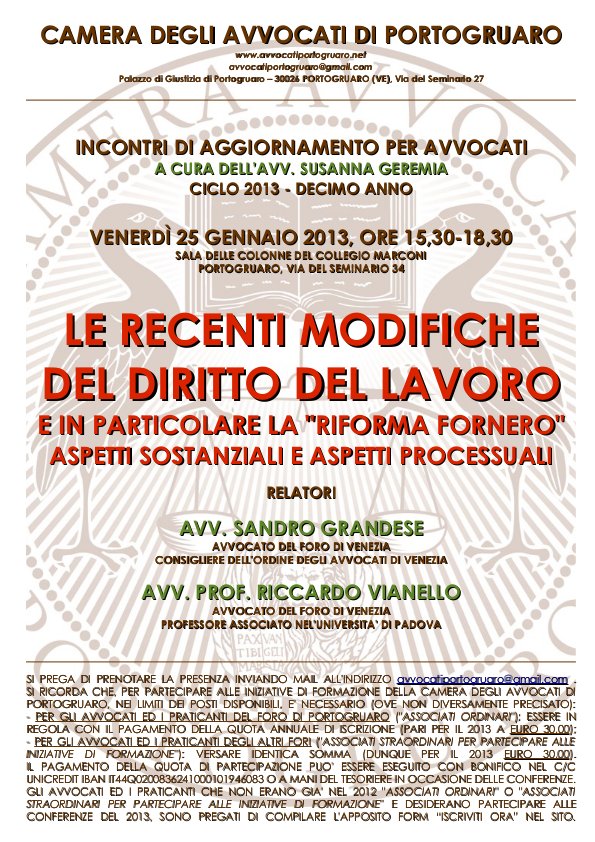 Oggi, prima di ricevere quest'ultima comunicazione, avevamo diffuso la locandina del primo evento (ossia quello di venerdì prossimo, 25 gennaio, sull'attualissimo tema, di rilievo non solo professionale ma anche sociale e civico, del diritto del lavoro e della riforma “Fornero”), indicando per le prenotazioni l'invio di una mail all'indirizzo della Camera.