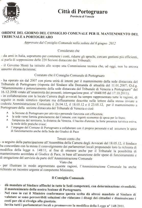 Pubblichiamo in appresso la delibera adottata dal Comune di Portogruaro in ordine al mantenimento della Sezione distaccata di Portogruaro del Tribunale di Venezia.
